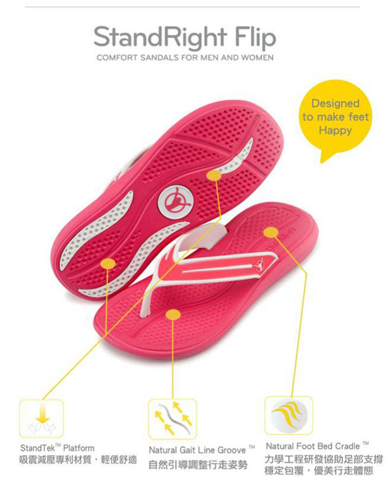 採用專利樹脂製作而成的人字拖鞋,符合足部曲線,並能巧妙分散行走時壓力,維持最放鬆的走路姿勢與施力點,讓雙足能行走的更加穩定與長久。
